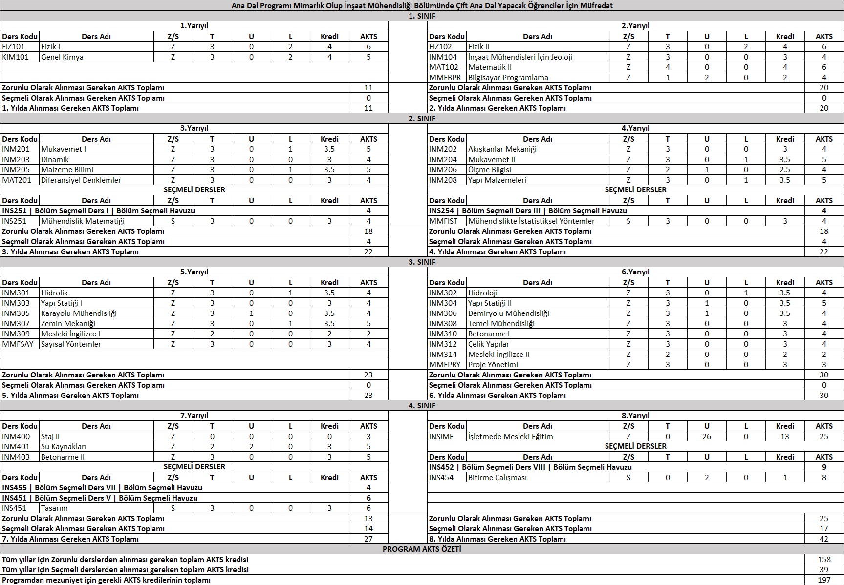 Ana Dal Programı Mimarlık Olup İnşaat Mühendisliği Bölümünde Çift Ana Dal Yapacak Öğrenciler İçin Müfredat