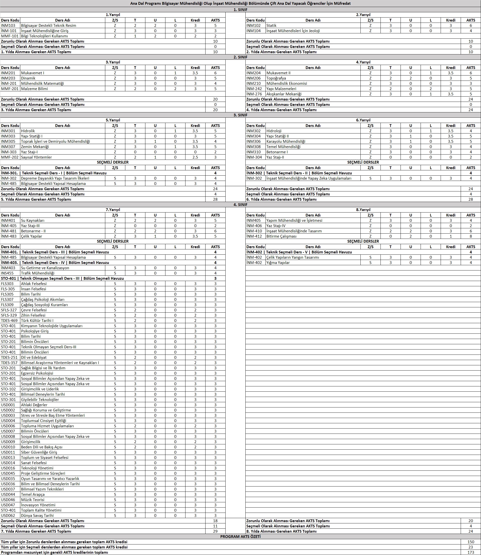 Ana Dal Programı Bilgisayar Mühendisliği Olup İnşaat Mühendisliği Bölümünde Çift Ana Dal Yapacak Öğrenciler İçin Müfredat (2024)