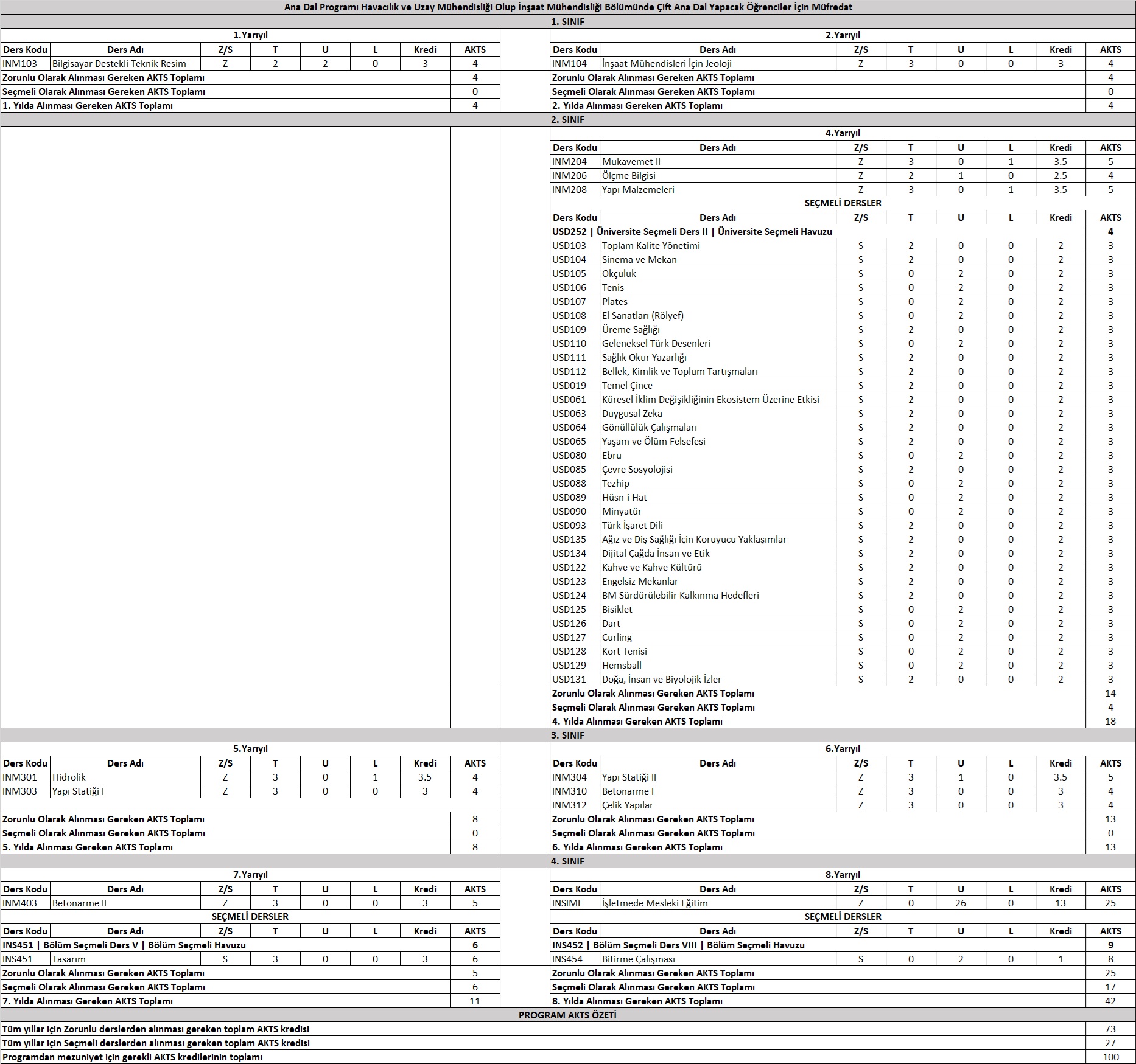 Ana Dal Programı Havacılık ve Uzay Mühendisliği Olup İnşaat Mühendisliği Bölümünde Çift Ana Dal Yapacak Öğrenciler İçin Müfredat