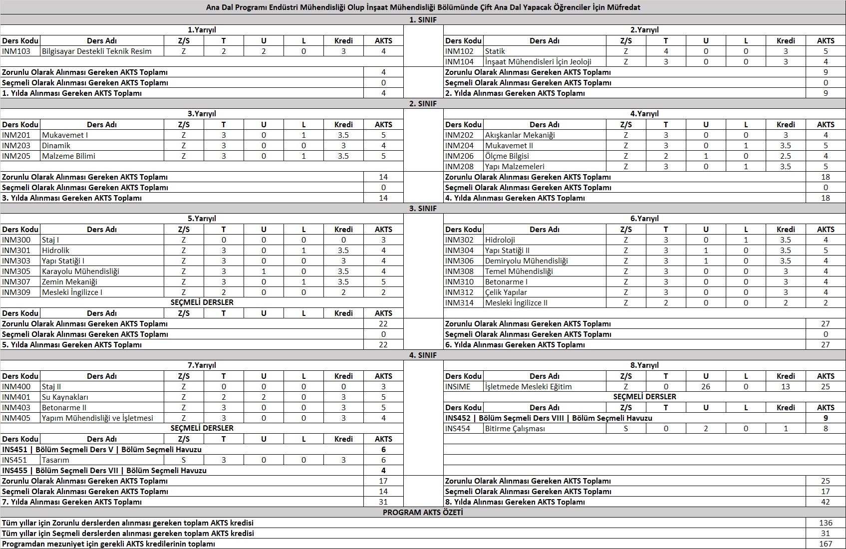 Ana Dal Programı Endüstri Mühendisliği Olup İnşaat Mühendisliği Bölümünde Çift Ana Dal Yapacak Öğrenciler İçin Müfredat