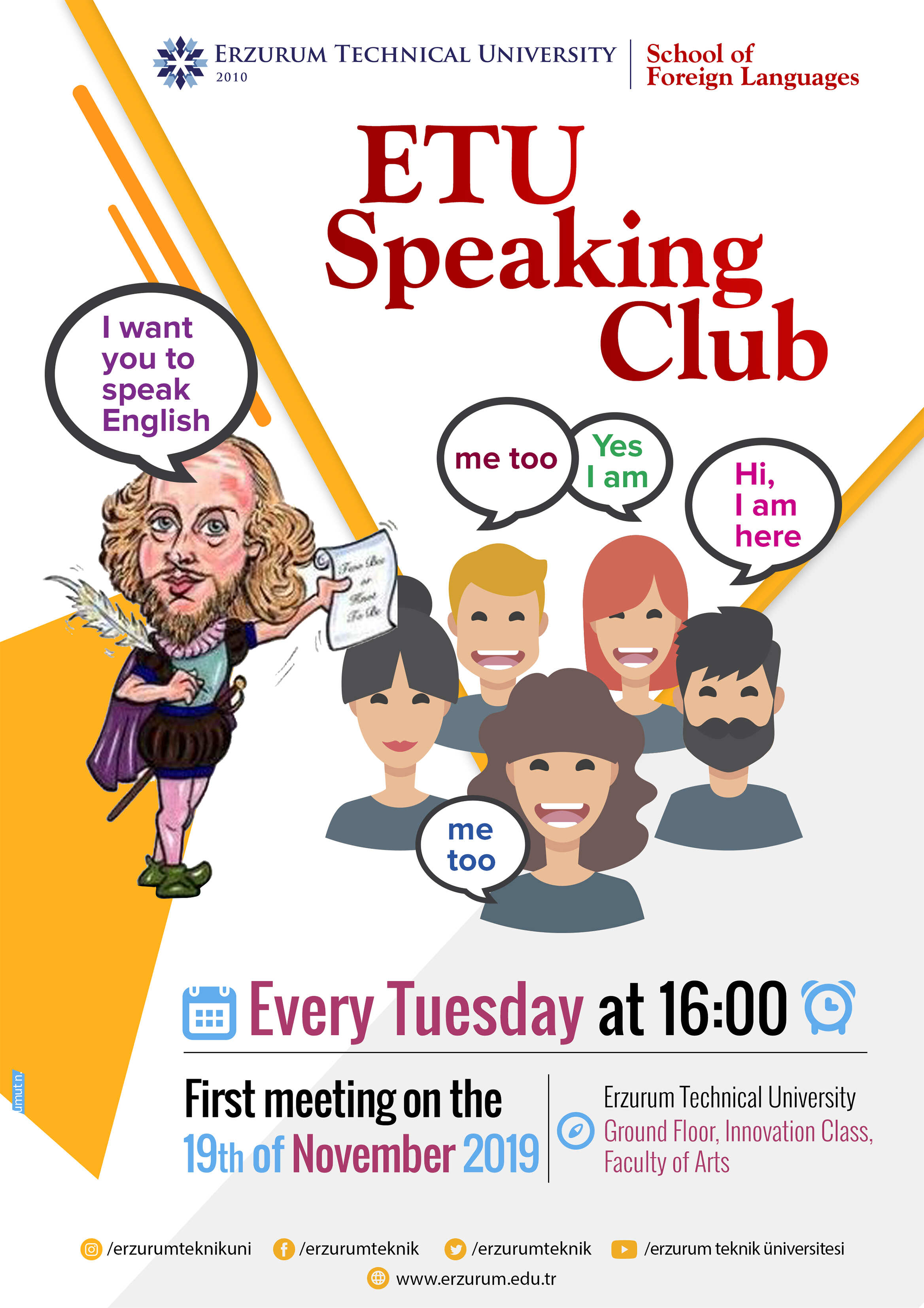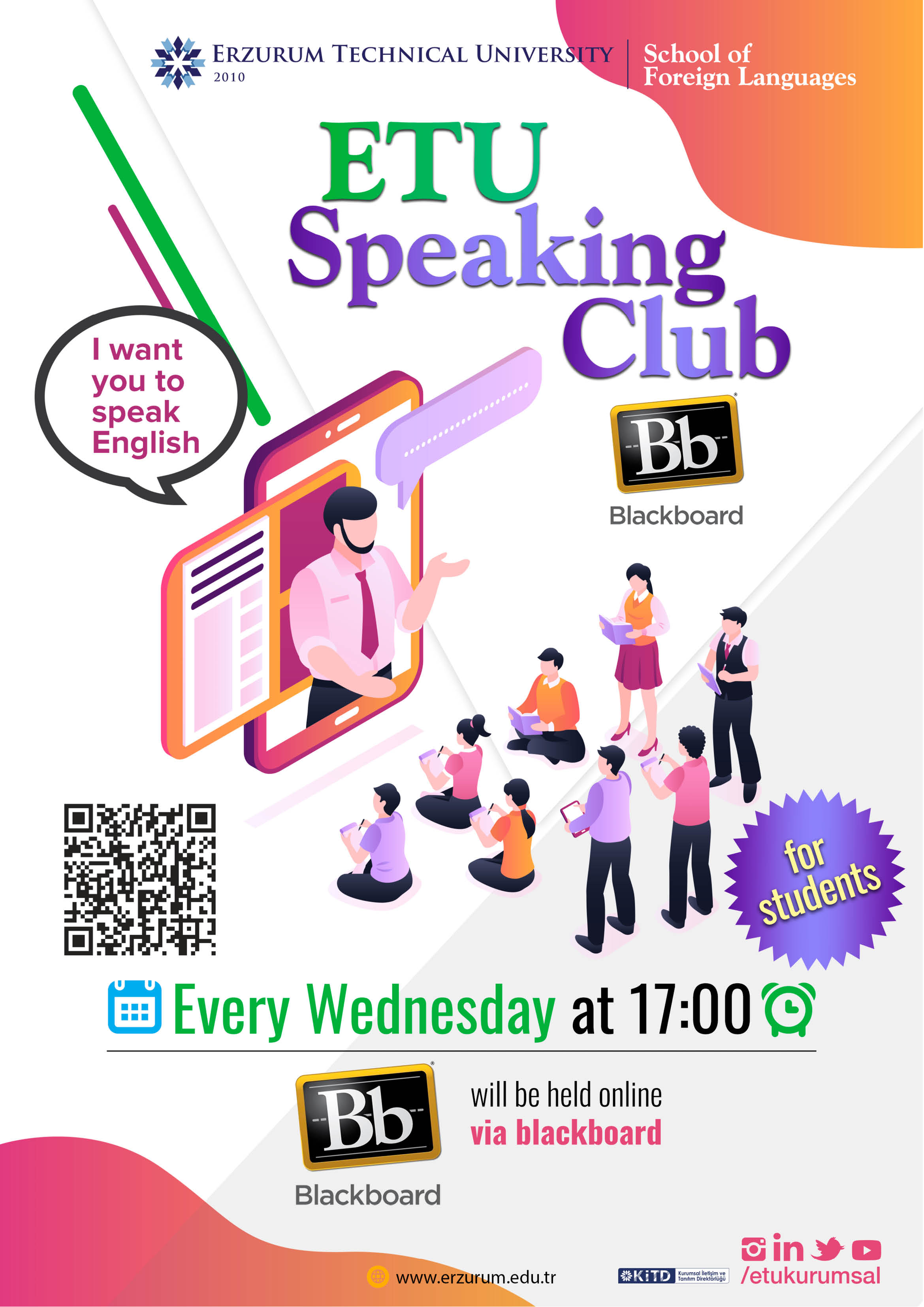 Konuşma Kulübü, öğrencilerin ve akademik personelin keyifli ve etkileşimli bir ortamda İngilizce konuşma pratiği yapmalarını sağlar. Kulüp oturumlarında, öğretim görevlilerimizin katılımıyla çeşitli oyunlar, tartışmalar ve grup etkinlikleri düzenlenir. Katılımcılar bu sayede hem kendilerini daha akıcı ifade etme fırsatı bulur hem de farklı bakış açılarıyla kültürlerarası etkileşim deneyimi yaşarlar.