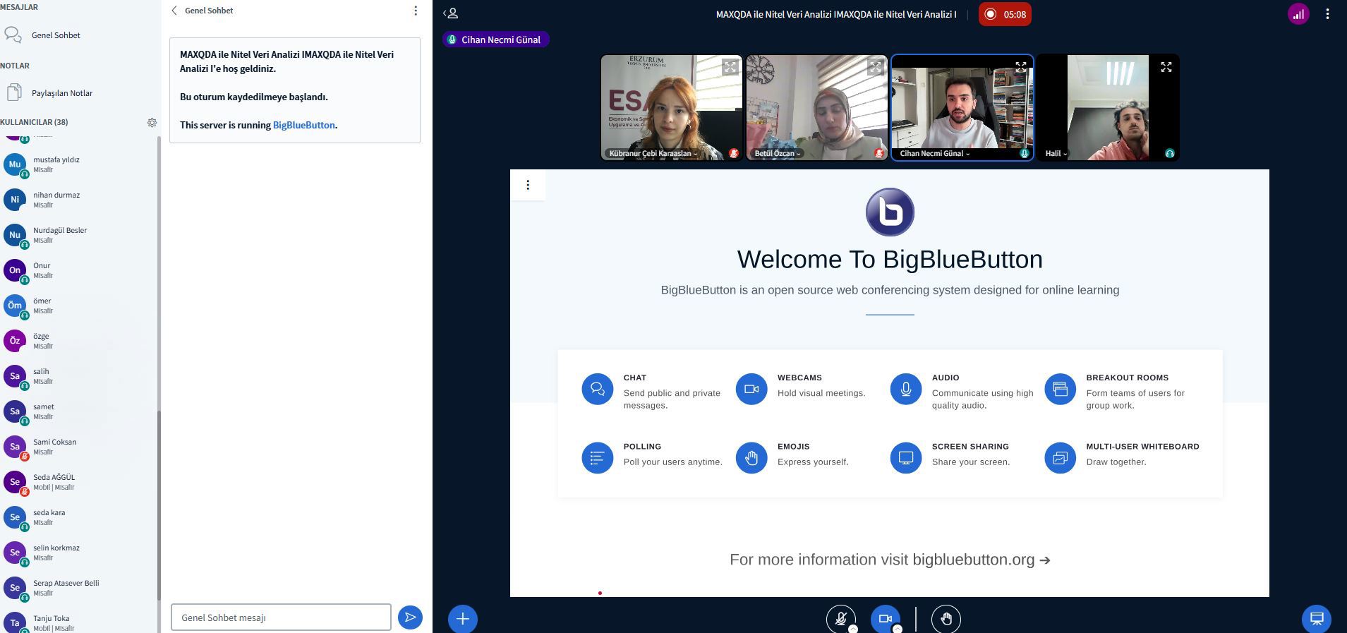 Erzurum Teknik Üniversitesi Ekonomik ve Sosyal Araştırmalar Uygulama ve Araştırma Merkezi (ESAM) ile Akademik Yazım Destek Koordinatörlüğü (AYDK) iş birliğinde düzenlenen MAXQDA Eğitim Serisinin ilk oturumu gerçekleştirildi. “MAXQDA ile Nitel Veri Analizi I” başlıklı çevrim içi eğitim, 05 Kasım 2025 Çarşamba günü saat 14.00’te Kocaeli Üniversitesi’nden Dr. Öğr. Üyesi Cihan Necmi Günal tarafından verildi. Katılımcılara nitel araştırma süreçlerine giriş, MAXQDA’nın temel özellikleri ve uygulamalı analiz adımları hakkında kapsamlı bilgiler sunulan eğitim yoğun ilgi gördü. Serinin yıl boyunca devam edeceği bildirildi.