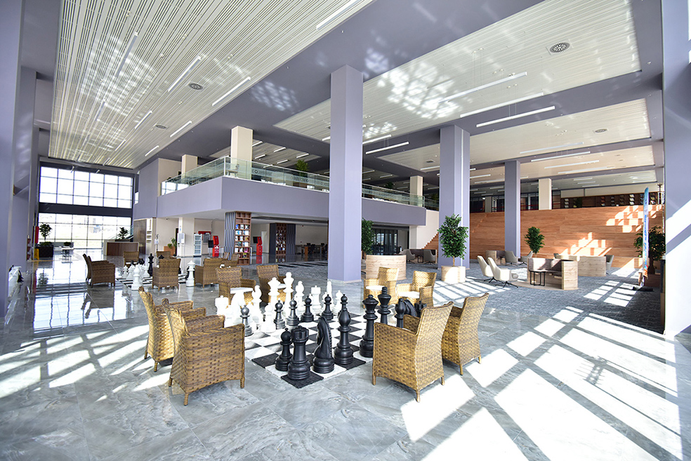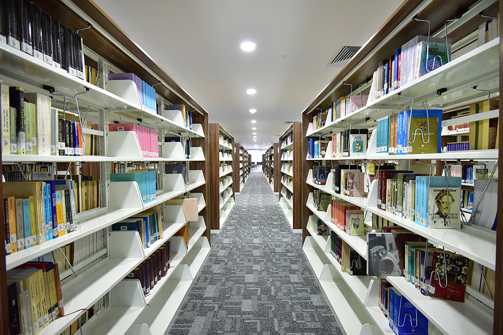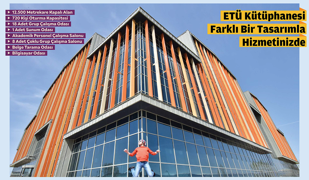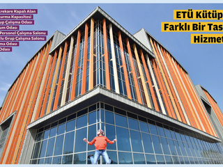 KÜTÜPHANE Gerek dış görünüşü gerekse iç mekanları açısından özgün bir tasarıma sahip olan ETÜ Merkez Kütüphanesi binası, 2019-2020 Güz Dönemi’nde hizmete girmiş bulunmaktadır. Okuyucularına ferah ve konforlu mekanlar sunan kütüphane, 12.500 metrekare kapalı alana ve 720 kişi oturma kapasitesine sahiptir. Kütüphanede 18 adet grup çalışma odası, 1 adet sunum odası, akademik personel çalışma salonu, belge tarama odası, bilgisayar odası, 8 adet çoklu grup çalışma salonu, Tez ve Süreli Yayınlar Bölümü, Erzurum Şehir Arşivi (ERŞA) ve ETÜ Yayınevi Koordinatörlüğü mevcuttur. Kütüphanede 50.000’in üzerinde basılı eser bulunmakta olup ayrıca Kütüphanelerarası Ödünç Sistemi (ILL) ve Belge Sağlama Sistemi (TÜBESS) hizmetleri, otomatik ödünç ve iade istasyonları ve fotokopi merkezi mevcuttur. |
