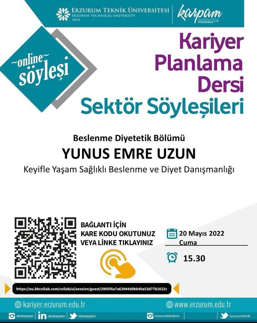 Üniversitemiz KARPAM birimi ve bölüm kariyer temsilcisi iş birliği ile düzenlenen sektör söyleşilerine Keyifle Yaşam Sağlıklı Beslenme ve Diyet Danışmanlığı sahibi Diyetisyen Yunus Emre UZUN konuşmacı olarak katılmıştır. Beslenme ve diyetetik öğrecilerine eğitim hayatından, işe başlama süreci ve farklı iş deneyimlerinden ve ofiste çalışan bir diyetisyenin sahip olması gereken özelliklerden bahsetmiştir. Söyleşi sonundan öğrencilerin sorularını da yanıtlayarak bu alanda çalışmayı hedefleyen öğrencilerimize yol gösterici olmuştur.
