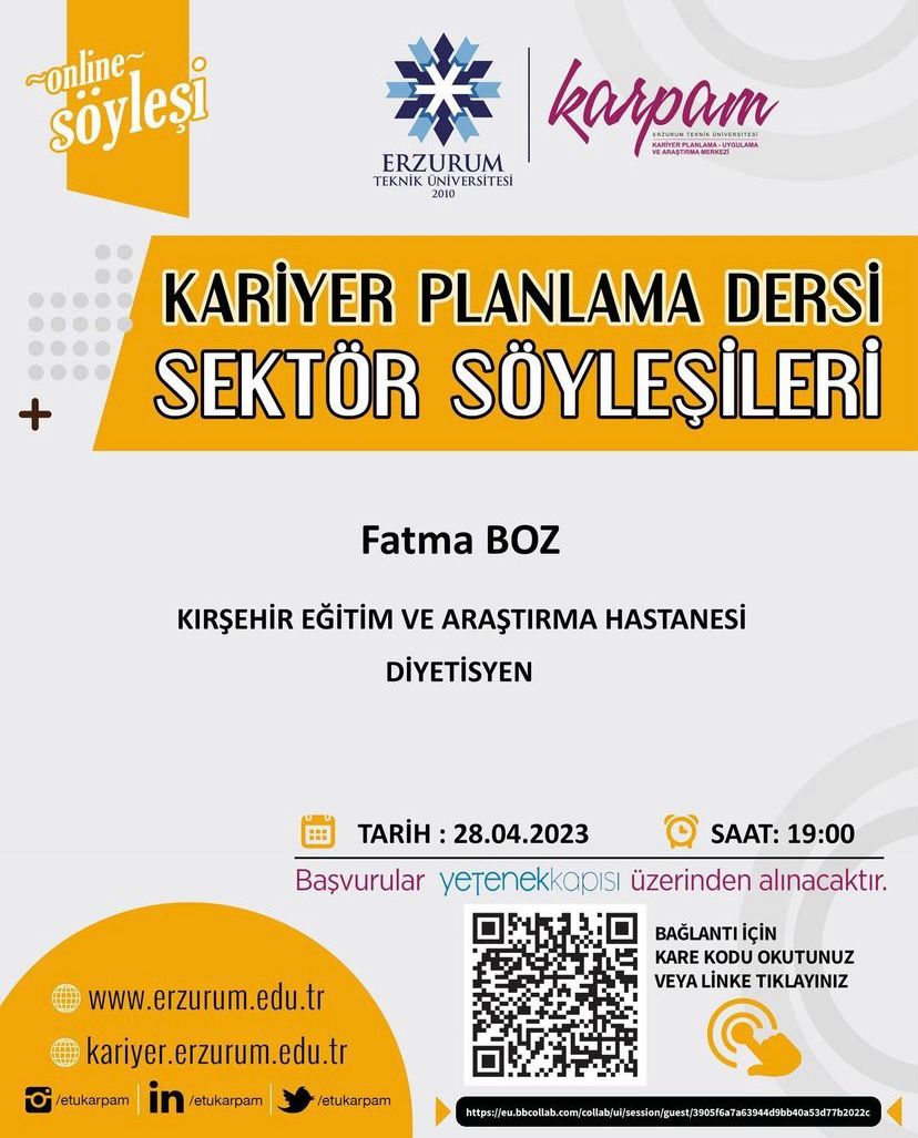Üniversitemiz KARPAM birimi ve bölüm kariyer temsilcisi iş birliği ile düzenlenen sektör söyleşilerine Kırşehir Eğitim ve Araştırma Hastanesinde çalışan Diyetisyen Fatma BOZ konuşmacı olarak katılmıştır. Beslenme ve diyetetik öğrecilerine eğitim hayatından, işe başlama süreci ve iş deneyimlerinden ve devlet hastanesinde çalışan bir diyetisyenin sahip olması gereken özelliklerden bahsetmiştir. Söyleşi sonundan öğrencilerin sorularını da yanıtlayarak bu alanda çalışmayı hedefleyen öğrencilerimize yol gösterici olmuştur.