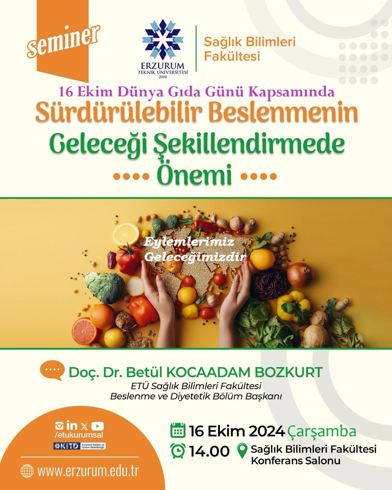 Beslenme ve Diyetetik Bölümü öğretim üyelerinden Doç. Dr. Betül KOCAADAM BOZKURT 16 Ekim Dünya Gıda Günü kapsamında "Sürdürülebilir Beslenmenin Geleceği Şekillendirmede Önemi" konulu seminerde fakültemiz öğrenci ve personellerini bilgilendirmiştir. Başta bölüm başkanımız Doç. Dr. Betül KOCAADAM BOZKURT olmak üzere emeği geçen ve katılım sağlayan herkese teşekkür ederiz.