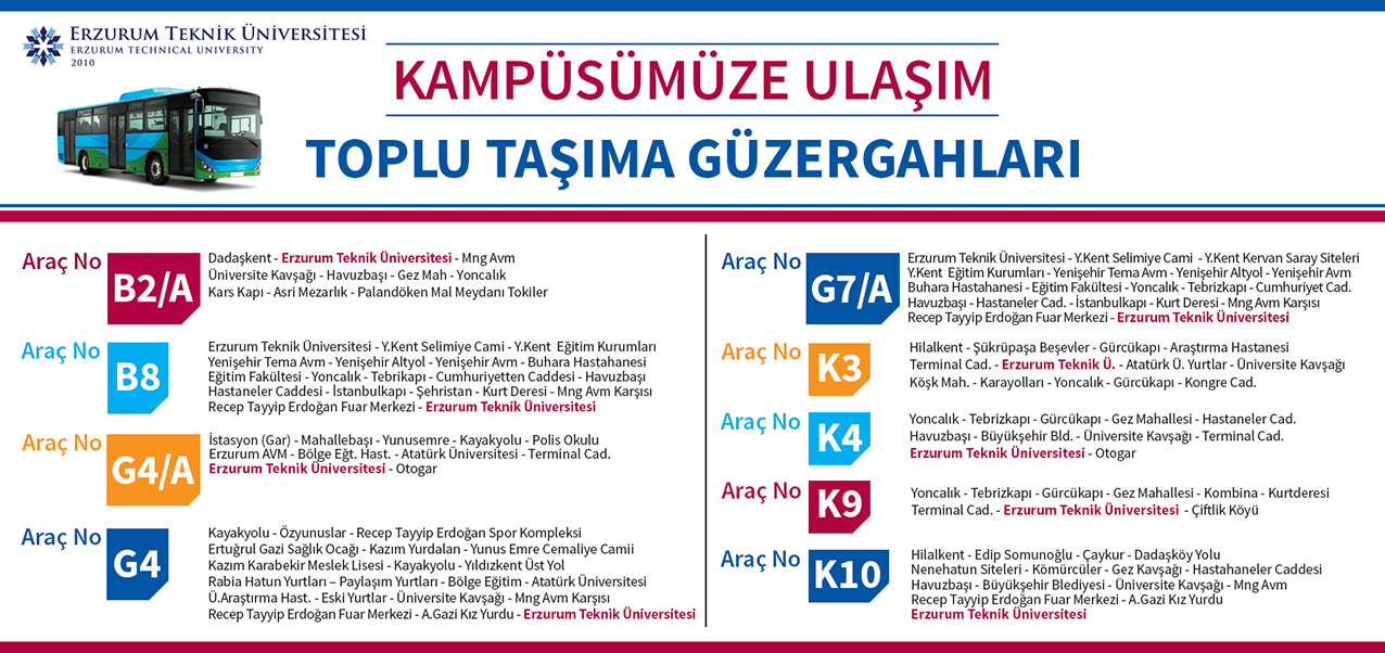 Üniversite kampüsümüze şehrin tüm noktalarından şehir içi toplu taşıma araçları ile çok kısa sürede ulaşabilmeniz mümkündür. Aşağıdaki listede kampüsümüze gelen Erzurum şehiriçi toplu taşıma hat bilgileri yer almaktadır.