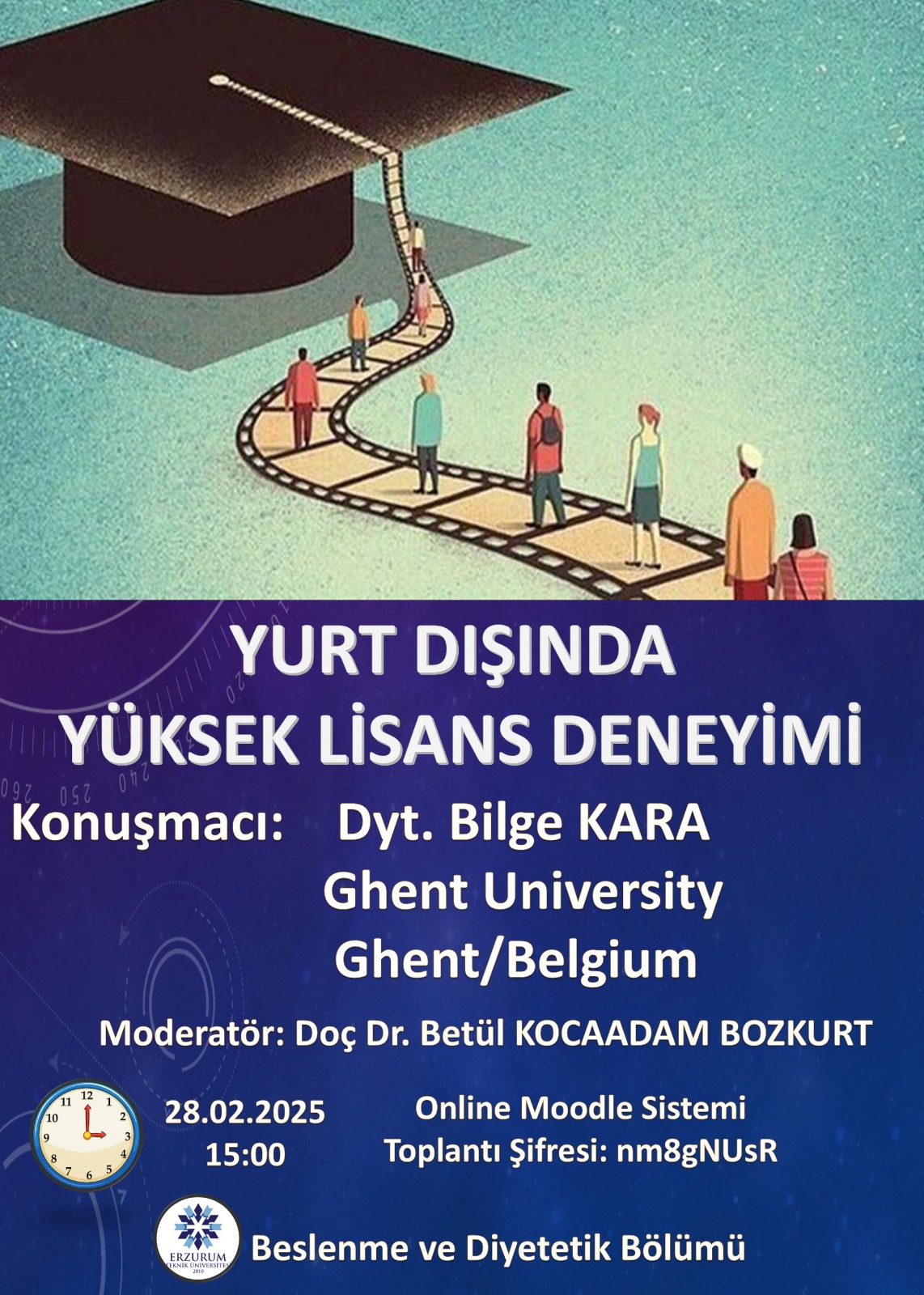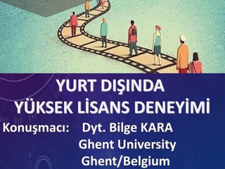 Beslenme ve Diyetetik Bölümü tarafından düzenlenen "Yurt Dışında Yüksek Lisans Deneyimi" isimli söyleşiye lisansüstü eğitimine Ghent Üniversitesinde devam eden Dyt. Bilge KARA konuşmacı olarak katılmıştır. Beslenme ve diyetetik öğrecilerine yurt dışı tecrübelerinden ve bu alanda yüksek lisanas yapmak isteyen bir diyetisyenin sahip olması gereken özelliklerden bahsetmiştir. Yurt dışında yüksek lisans yapmayı hedefleyen öğrencilerimize yol gösterici olmuştur.